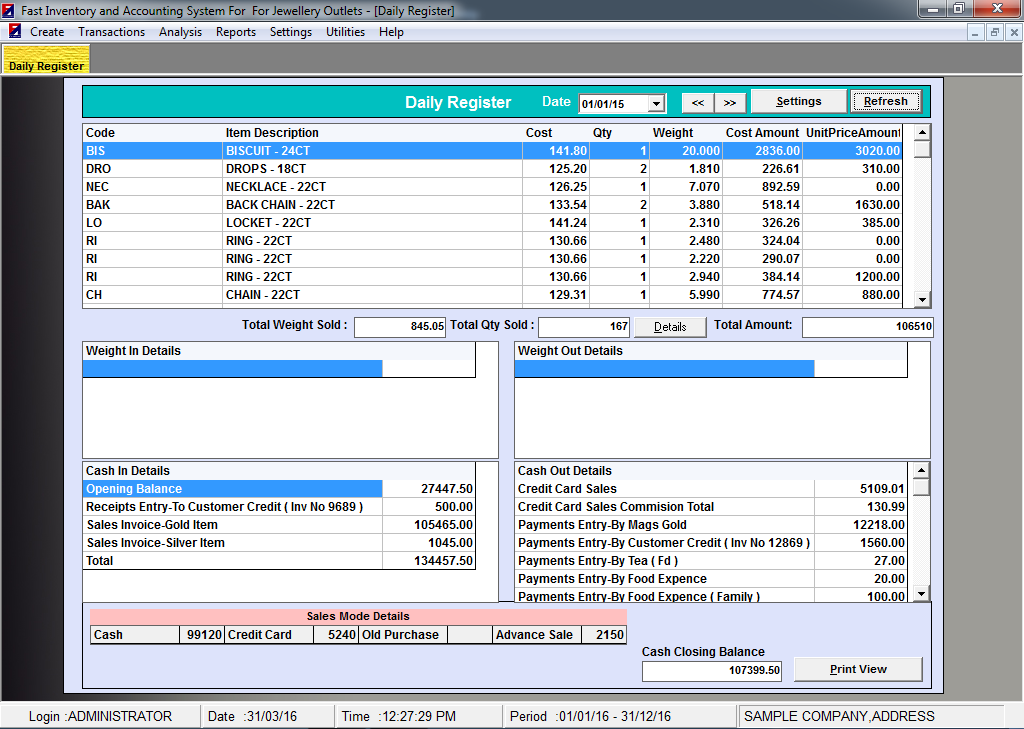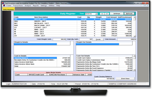 A summarily view of transactions occurred in the business at a day is meaningfully and systematically ordered in this Daily Register window with all possible information related to the entries. All most all users are making use of this analysis report daily, because it gives information about the items sold, their cost, quantity sold, weight etc… with total weight in details and total weight out details accurately. Another important thing is that it also gives a brief report on the cash details such as, total cash in details and total cash out details, there by cash transactions happened in the business at a day can be easily tracked and system cash balance can be tallied with balance of business cash. Total cash, credit, credit card, old purchase and advance sales will be differently seen on this report with facility to print and export the report.