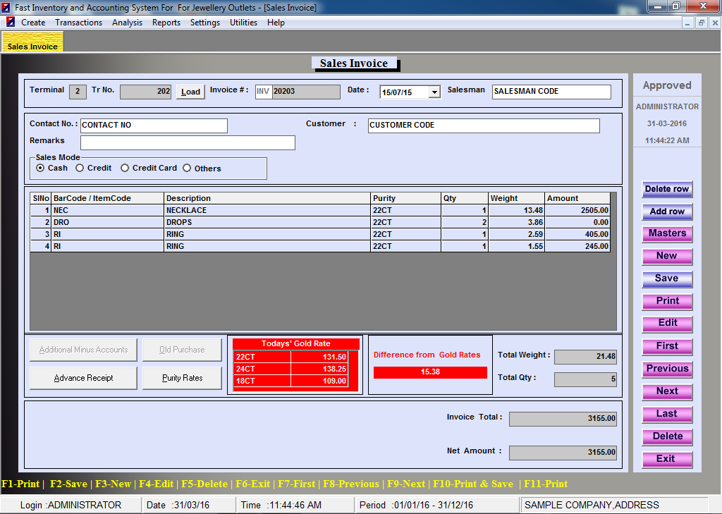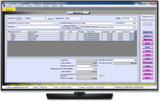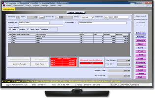 Jewelries will be sold out by entering the information about the particular item of jewelry in the sales invoice window by entering its weight, quantity and purity. Today’s gold rate can set out by clicking Purity Rate button and it will be highlighted in the sales invoice in red color also. Another important feature available for jewelry industries is that, Advance Receipt and Old Gold Purchase can be scientifically and efficiently processed while entering sales invoice, so customers related to these transactions can be easily and quickly processed and dealt with.