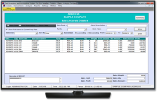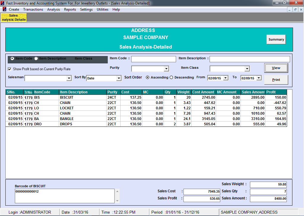 Here users can take an analysis and interpretation study about the sales and profit of the running business during a specified date of period by looking into the Sales Analysis Detailed window. Full information about the sales particularly name of item, purity, cost, MC, quantity, weight, profit etc… are clearly illustrated in this window with totals of sales weight, sales quantity, sales amount, sales cost and sales profit. Profit report can be generated based on the current purity rates also by providing a tick mark on the respective feature available on the top left of the window. Sales report will be available based on item class and purity wise by selecting the corresponding names on the respective columns, and it may help to take crucial and meaningful decisions on the part of sales in various item classes and there by efficient and effective business management can be attained and maintained.