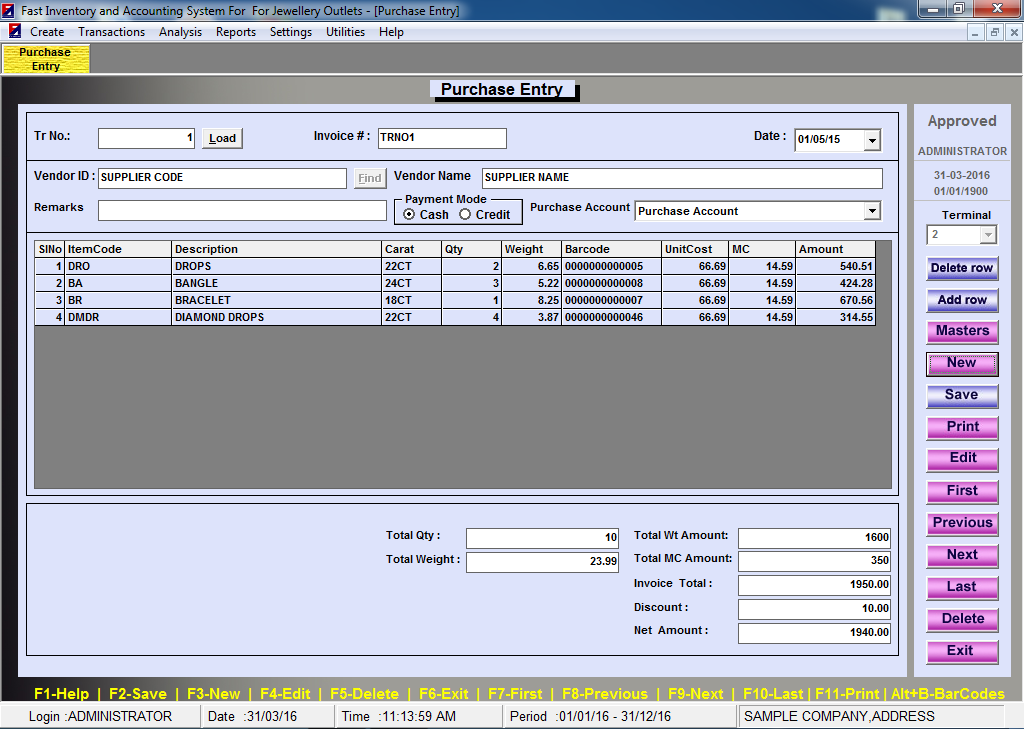 Purchase entry in the case of jewelry is a different one when it compared to other industry, because here we enter the weight, carat and MC (making charge) followed by the name of item and the unit cost. Total weight amount and total MC amount of the whole purchase bill will be available on the bottom of the purchase entry.
