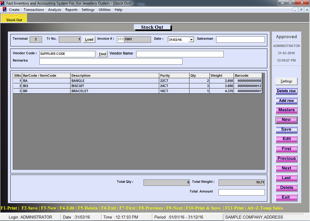 Stock out entry means to enter details of items that are delivering to the parties for making, shaping or reshaping the items from the base model to another customer attracted model. The name of item, purity, quantity and the current weight will be recorded in this entry for future reference, there by actual stock in the business and stock with other parties can be easily identified and tracked.