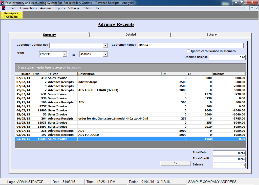 An analysis report is also available for checking the accounts of each customer; they are always dealing with advances. Users can take summary and detailed report of customers followed by a separate report for scheme customers also, there by homogenous reports on various customer balances between different dates can be generated and printed.