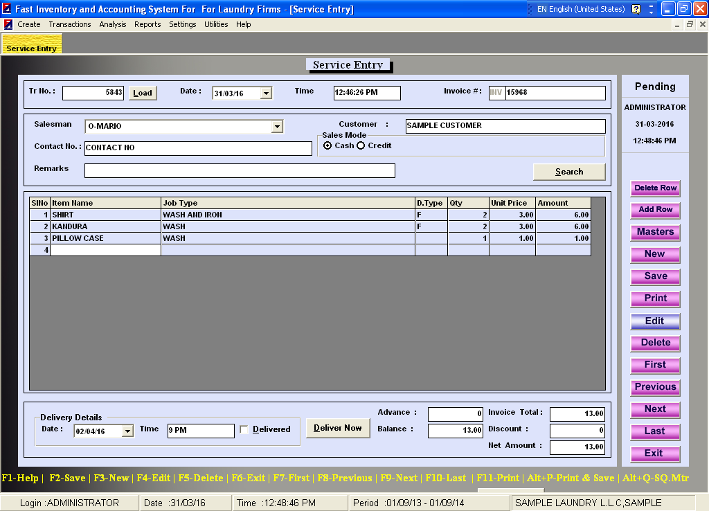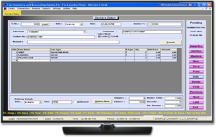 Service entry in the case of laundry is very simple, because here we enter the name of items, job type whether it is wash or iron, delivery type whether it is folding or hanger followed by quantity and unit price. Users can provide advance given by the customers and preset the delivery details such as delivery date and delivery time etc... If the items are ready for delivery, one can change the status of service entry to deliver by simply clicking deliver now button seen in the bottom center of the window. Accounts of credit customers can be correctly maintained by changing the sales mode to credit, followed by the name of customer, so particular bill will be debited on the corresponding customer accounts.