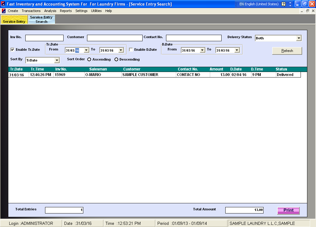 It is the search facility to quickly find a service entry from the whole list; here users can search a particular service entry by entering invoice number, contact number, customer name, delivery status whether it is delivered, not delivered and both of them. Full details of all service entries are chronologically and systematically ordered according to the date given by the user including the total service amount. Delivered and not delivered entries can be separately shown on this report by changing the delivery status field; there by quick analysis of entries can be possible.