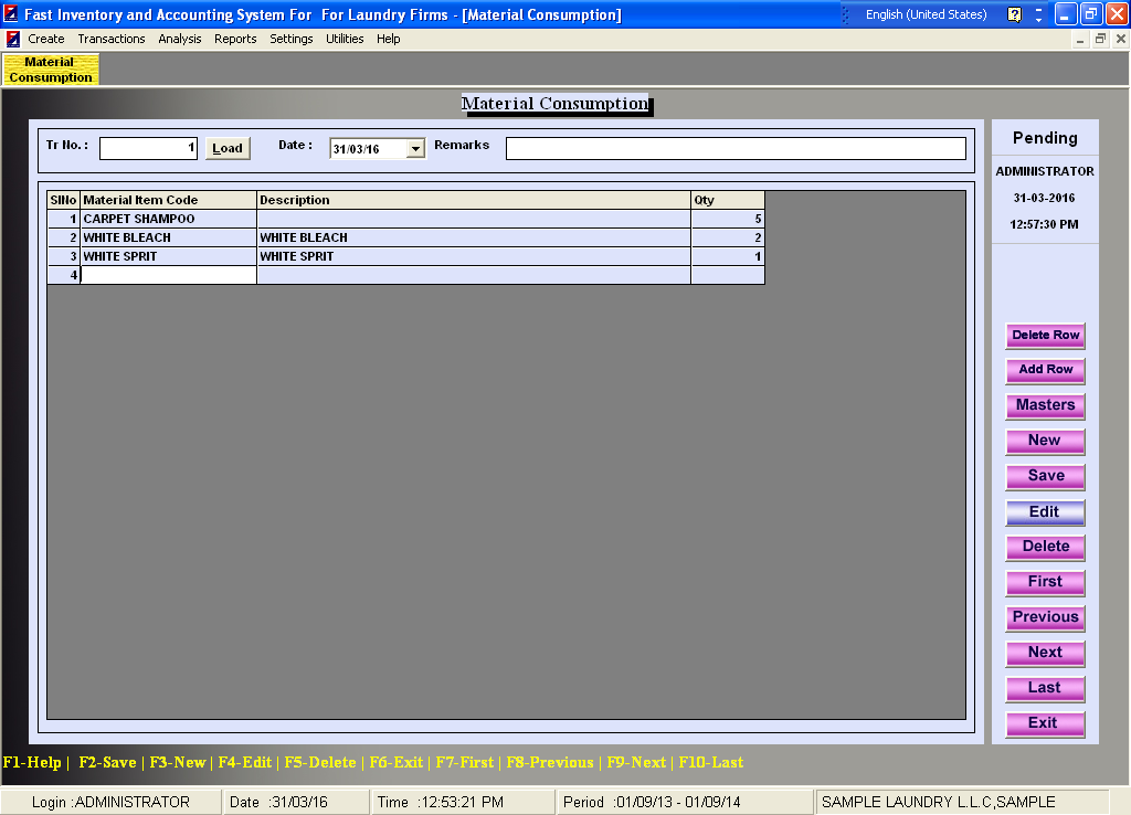 Laundries are keeping stock of materials used for washing and other laundry purpose, so people demanding handling of such materials systematically for maintaining accurate stock details. There by we included an additional entry for the same named material consumption. Name of material and quantity used on a day for the entire work is entered here and stock and cost of such materials will be automatically processed and manipulated.