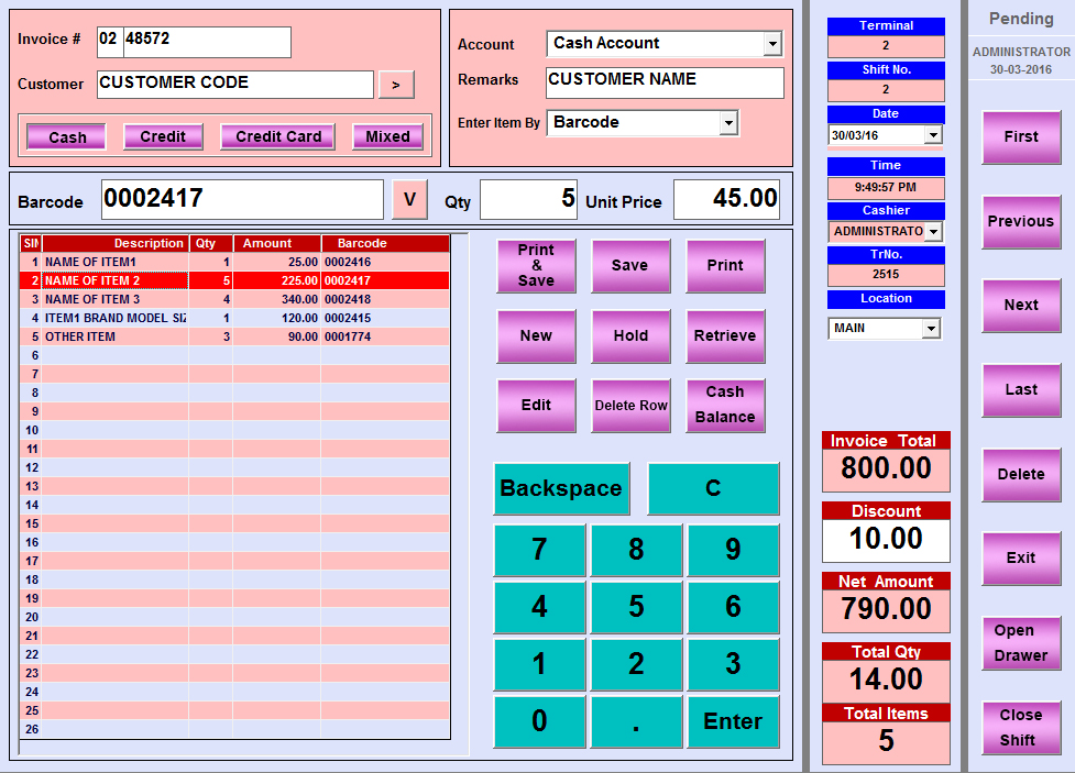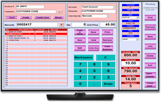 Here we enter sales transactions by scanning the corresponding barcodes or entering the name of items. It is specially designed for enabling touch system in the POS window, so entries can be made quickly and easily. You can see lot of buttons on this window; this can be used effectively for various needs and situations. And also various shortcuts can be used for enabling or doing special things on the POS window at the time of sale, information about the same is also available at the bottom of the window.