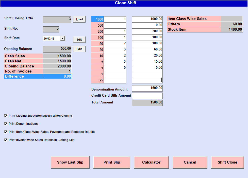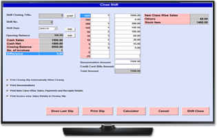 Close shift is used for shifting or closing the shift of one person from the responsibility of doing sale entries in the POS window. After closing the shift another person can log in to the POS window by providing the date, opening balance and log on password, so security, privacy and responsibility can be retained and maintained. A close shift slip can be printed out with details regarding all cash and credit sale entries, details about item class wise sales, reports on various payments and receipts other than sales etc… All the details about cash transactions between the particular shifts will be available in the report even with various cash denominations.