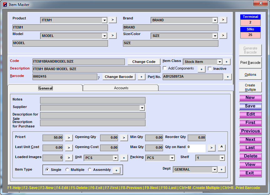 The first step of software implementation in any business is to create the name of items that are transacted there, by providing its brand, model, size, color, barcode etc… Here you can see item master in the create option; this is used for creating the various names of items. Once you created a name, it will be saved in the software for ever; you don’t need to create once again when the same item is transacted again in the business. There are lot of characteristic features are included in this item master window, a summary of these are explained in the following lines.