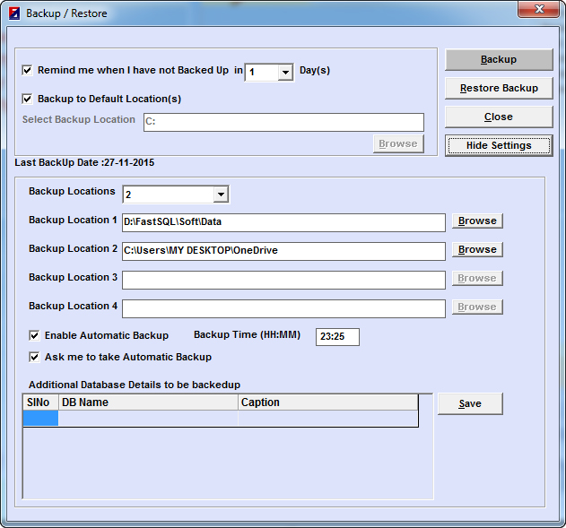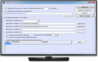 We are always recommended to do backup on regular basis, because we always giving first priority for safeguarding your important data. For that purpose there is a facility to do backup in the software. You can allocate multiple locations for saving your data; there by a copy of your data will be automatically copied to another location. If one of the data locations is damaged, the same will be secured on another location. You can schedule the backup according to your discretion and a simple technique of restoring and viewing the data is also included with this system.