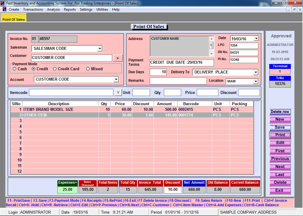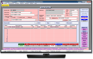 Point of Sale (POS) is used for making sale entries and generating bills of invoices to the customers by inputting name of items or corresponding barcode, part no if any, followed by quantity and selling price. Currency other than local currency can be used for making invoices if the sale in foreign currency. Lot of advanced features like selection of location, hold and retrieve even after one or more days, quick link for conversion of Performa invoice into sales, delivery note into sales, alert options for costless sales, out of stock sales, price level less sales etc. improves the users efficiency and accuracy in handling accounts and inventory. Users can select different modes of payment likely cash, credit, credit card and mixed. In the mixed mode a user can select multiple modes of payment for making single invoice according to the circumstances. Additional expenses and terms and conditions related to the specific invoice can be easily added to the bills of customers by the use of shortcut keys. The system automatically takes last price of customers by accessing to the last visit sale entry; it helps the users to make the bill very confidently and in a systematic manner. Besides all of these, a user can cross check the purchase and sales details of a specific item while he/she making invoices, there by quick and right decision can be taken at the right time according to the needs of the customers. All the features and links from the POS window are fully driven by shortcut keys, so the users can quickly access to the specific feature and can handle their customers very speedily.
