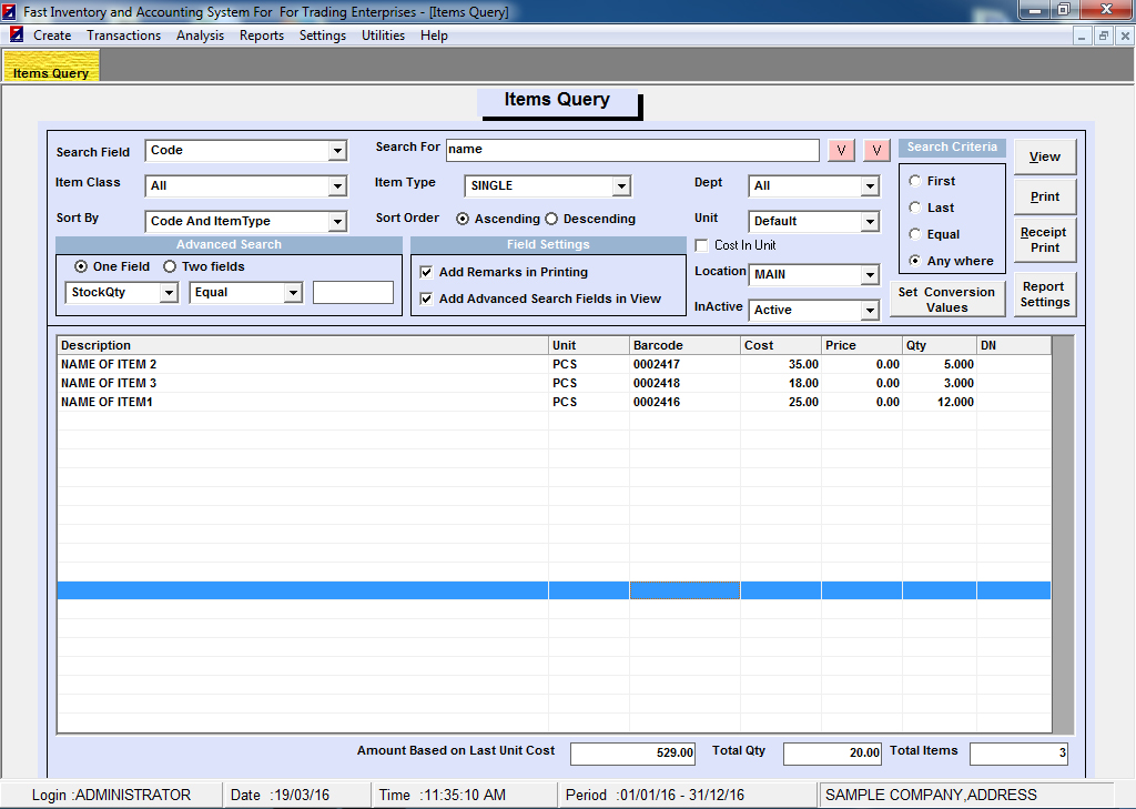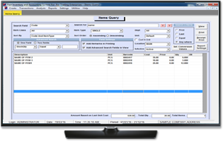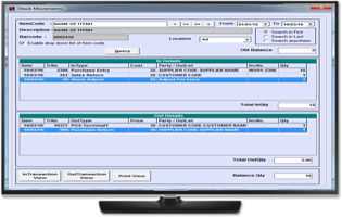 The complete stock of all items is auto arranged in the items query window with its quantity, barcode, last unit cost and the selling price. We can check the details of any item by inputting its name, barcode, part no, shelf no, item class, supplier name if any, and can access to the stock movements and item master windows of a specific item selected by the user. If any user needs location wise and item class wise stock report, he/she can retrieve the same by selecting the proper location or item class.
