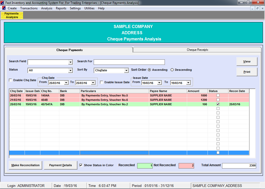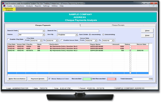 A detailed report containing information about cheques issued and received is available on this feature of analysis. Reconciled and not reconciled cheques are differently grouped for user’s quick attention and there is link for reconciliation also if the user wants to reconcile a particular cheque. Different colors are used for easy detections of cheques those are reconciled or not reconciled.