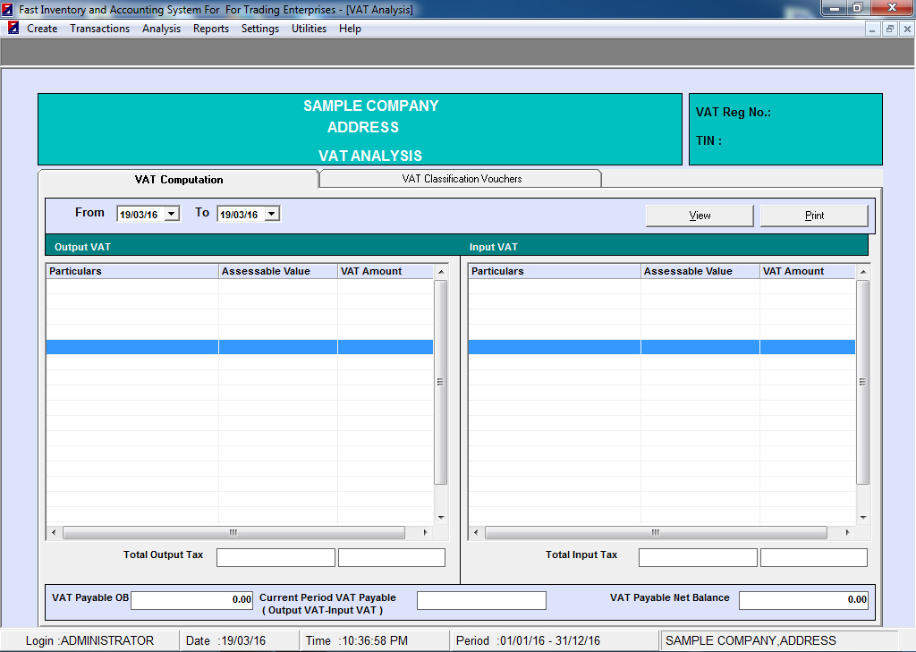 Value Added Tax (VAT) is a statutory process, so this will have a great impact on business transaction. That is why we added an additional module for enabling VAT. In this VAT computation window, a normal user can get into the information of VAT Payable/ Receivable during a particular period selected. Total output tax and input tax from various transactions are systematically ordered for easy understanding.