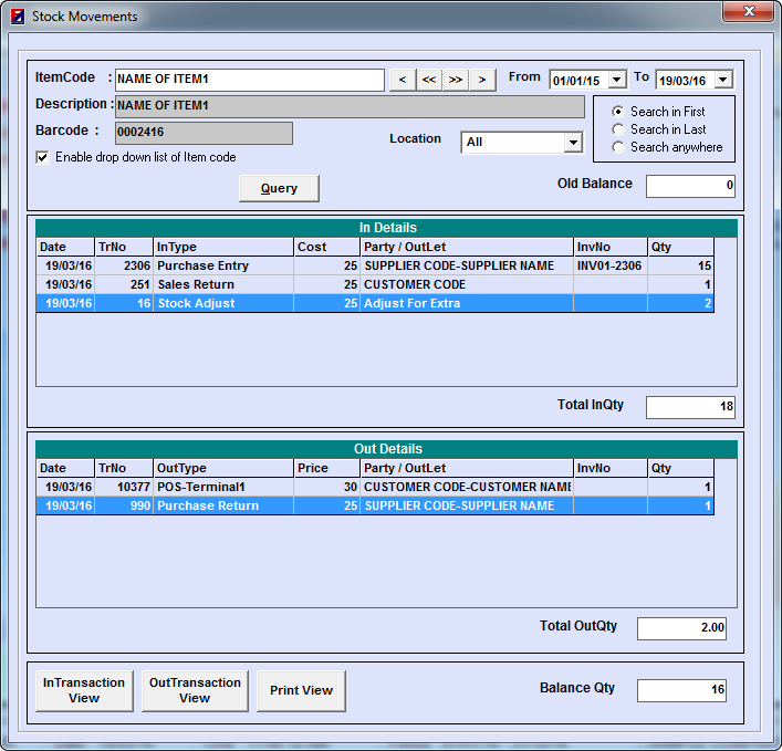 The movement of stock items is clearly depicted in this window with all possible information available through a single mouse click. A user can take decision according to the movement of items whether it is fast moving or not, and easily track the transactions belong to the particular item.