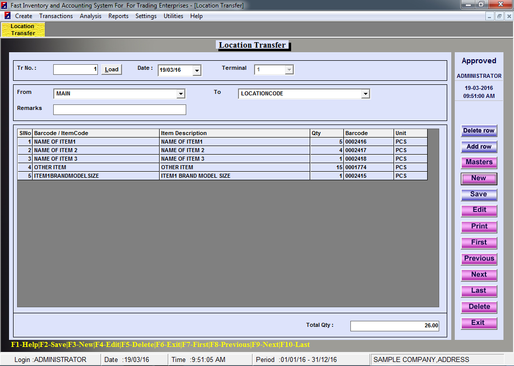This entry is mainly used for transferring items from one location to another location by inputting its name and quantity. Business with multiple locations for storing its stock items is mainly using this facility. Accurate location wise stock can be achieved by using this entry.